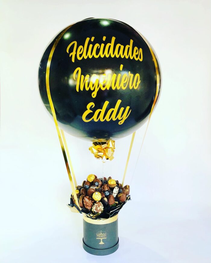 Un arreglo lleno de felicidad y satisfacción para los graduados. Contiene chcolates ferrero, fresas cubiertas de chocolate y un globo personalizado.