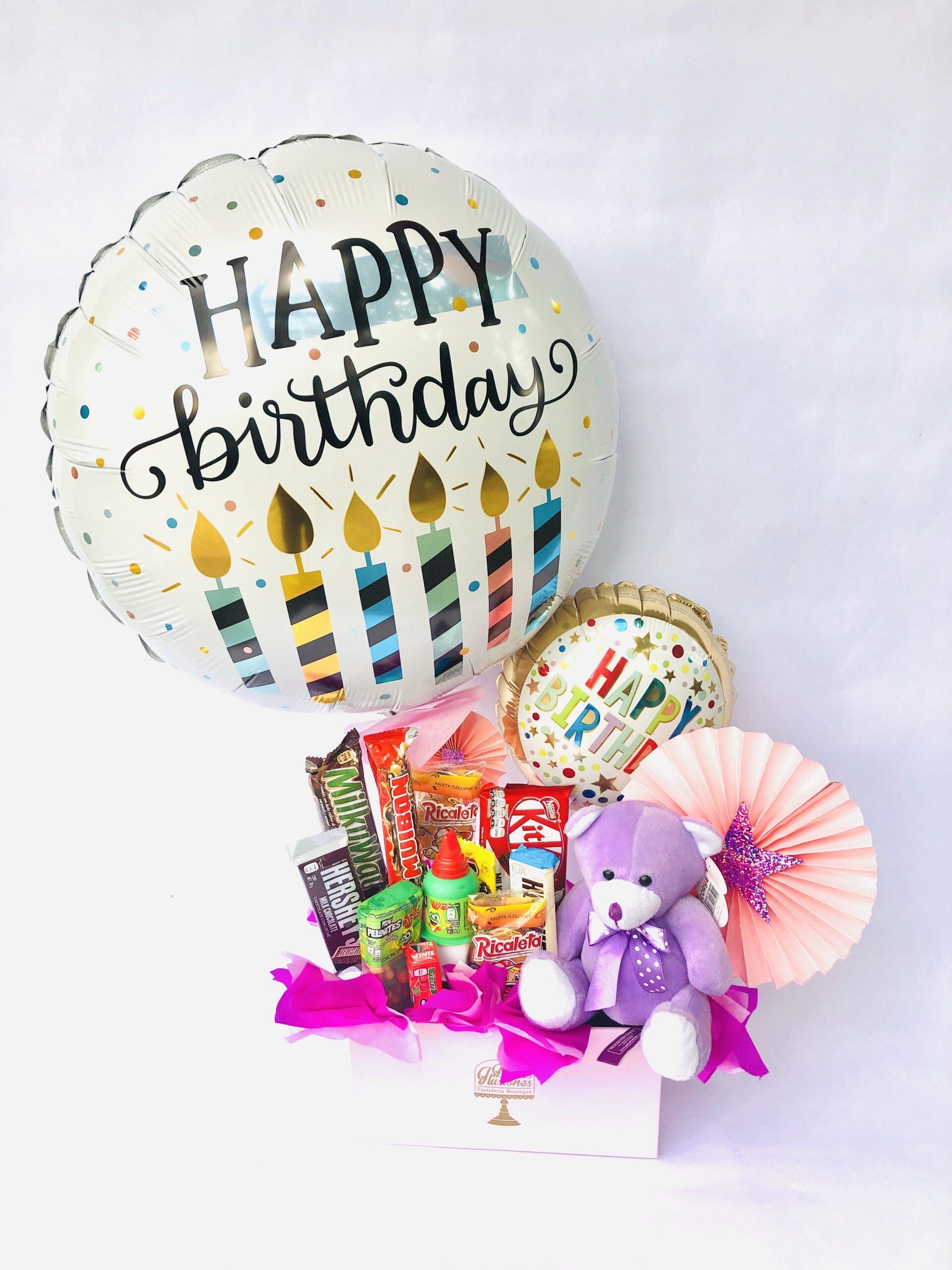 Un detalle especial para celebrar un año más. Este arreglo contiene dos globos, dulces, chocolates y un peluche.